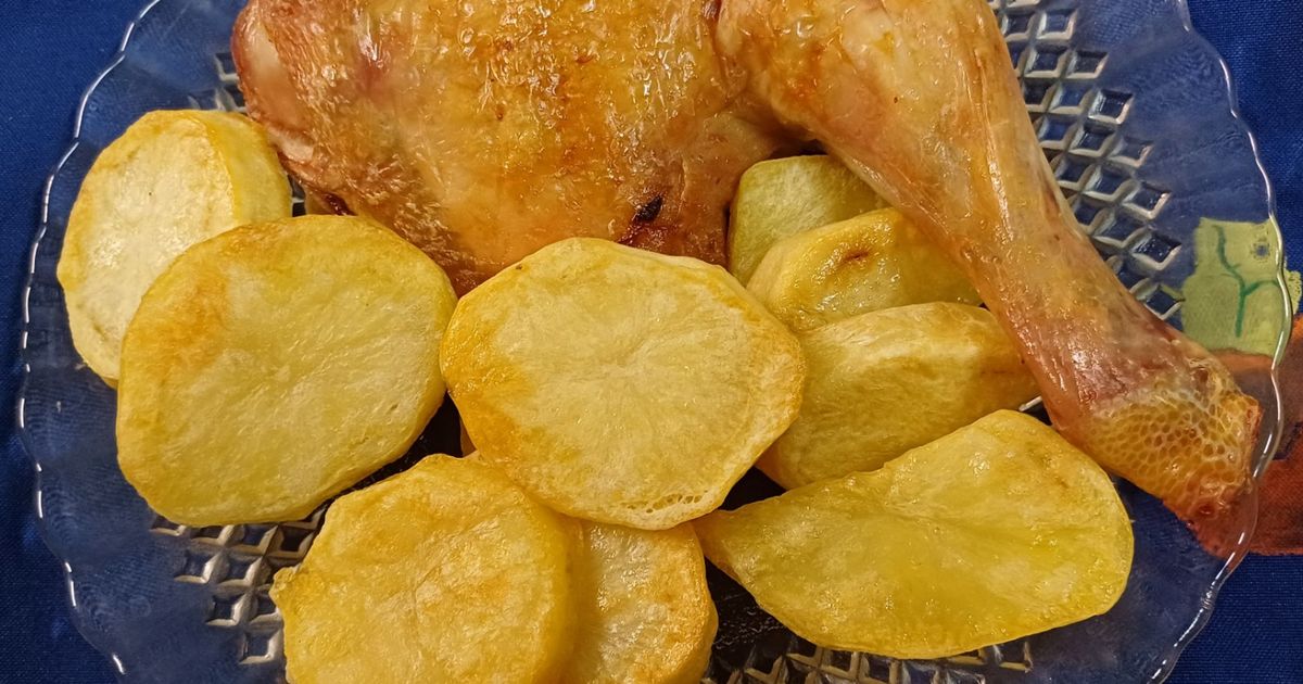Muslo de pollo al horno con papas doradas, un plato noble y bien logrado.