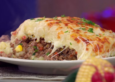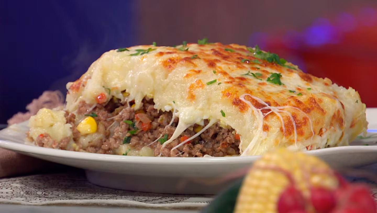 Pastel de carne casero, sabroso y abundante, con una capa de papa suave y dorada.